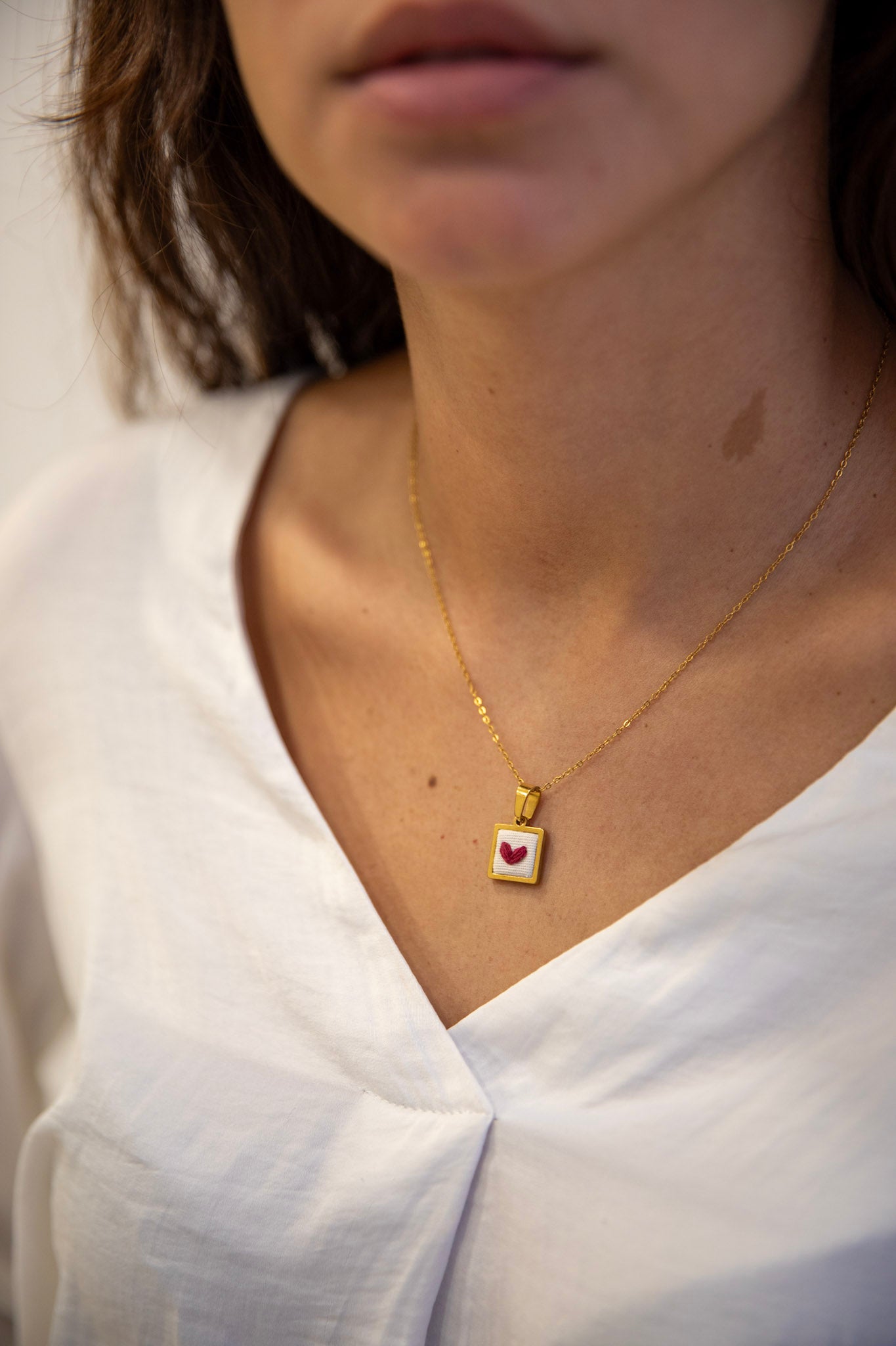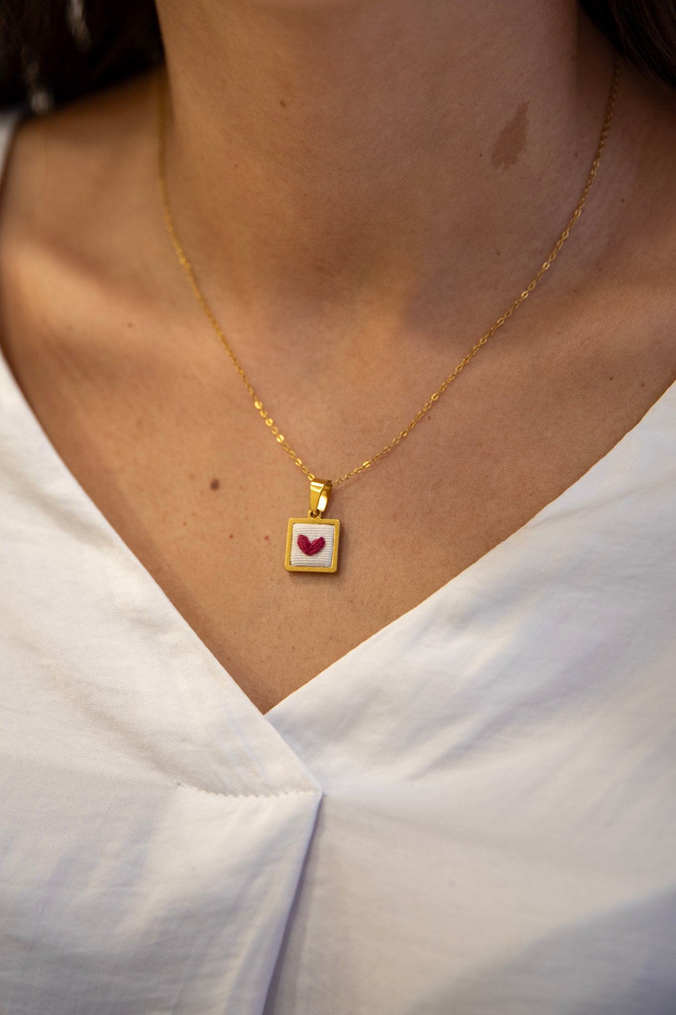 Por serem feitos à mão, os corações bordados dos pendentes podem variar um pouco a sua forma, pois cada bordado é único.