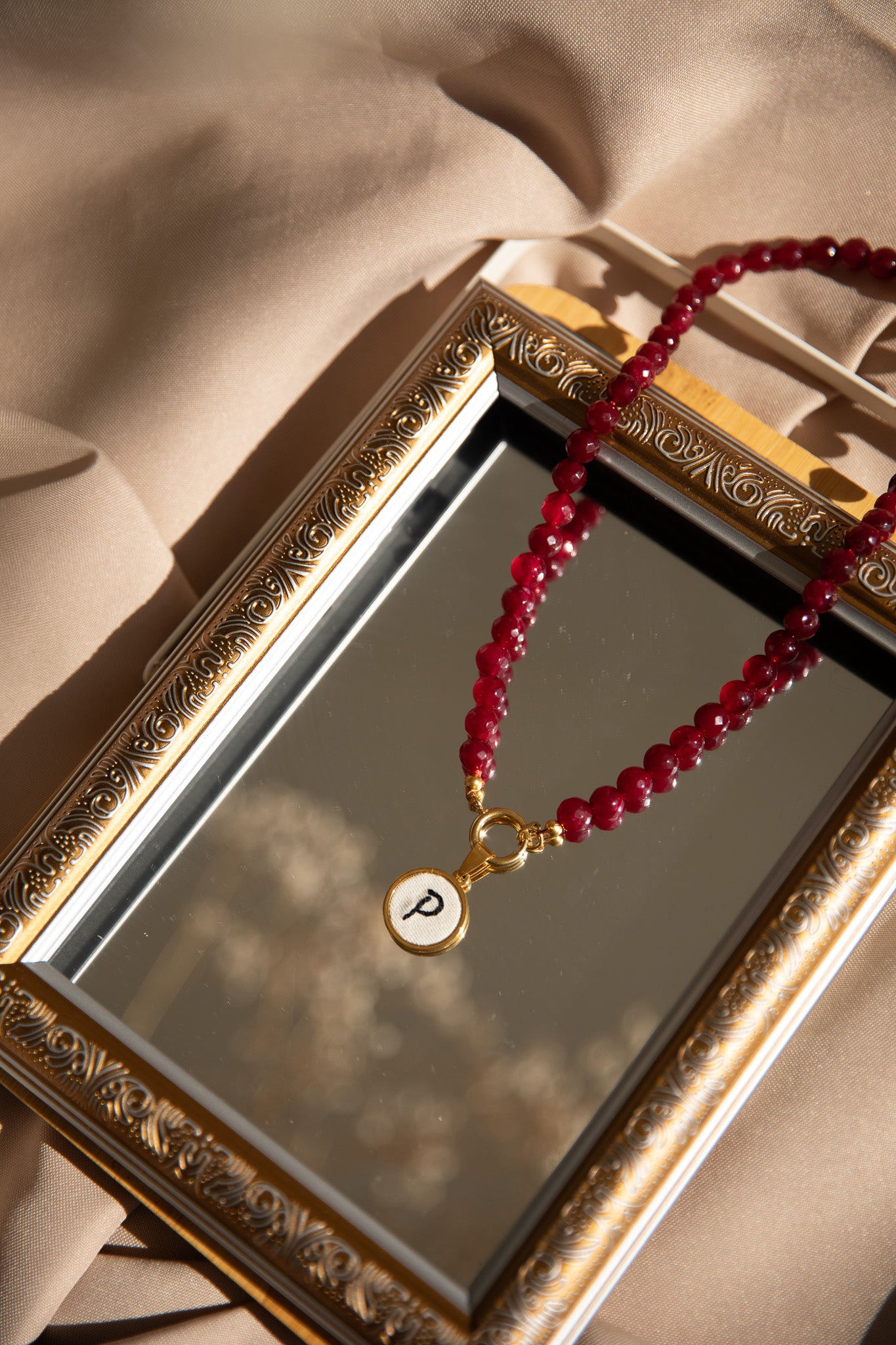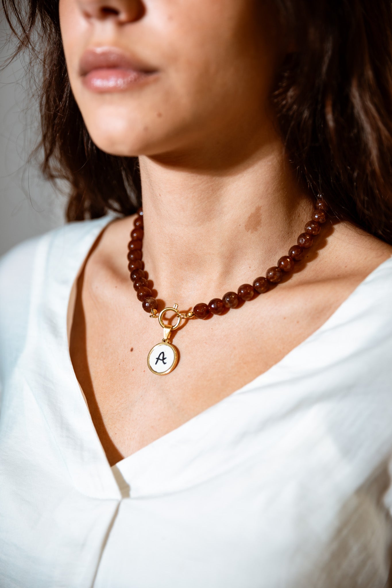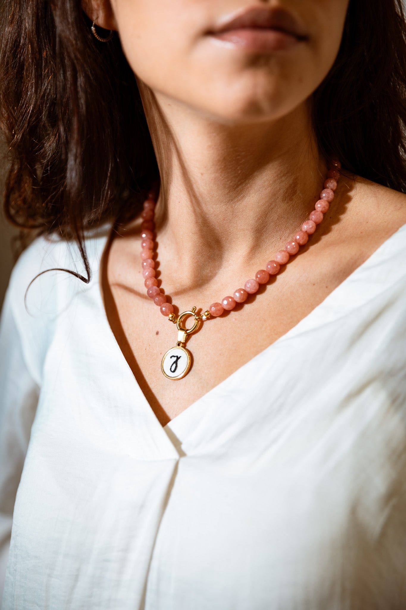 Colar de pérolas com letra bordada