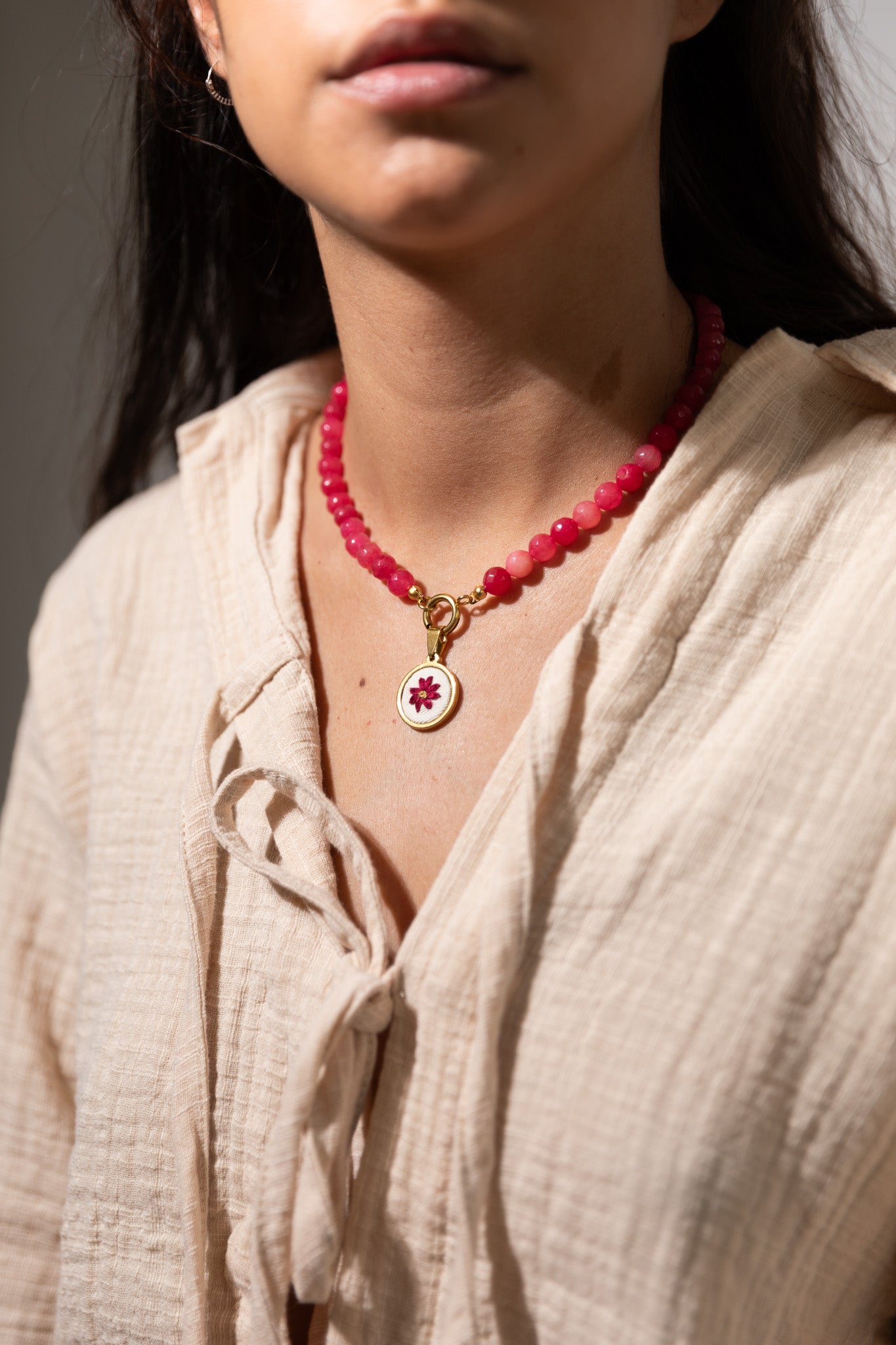 Por serem bordadas à mão, as flores dos pendentes podem variar um pouco a sua forma, pois cada bordado é único