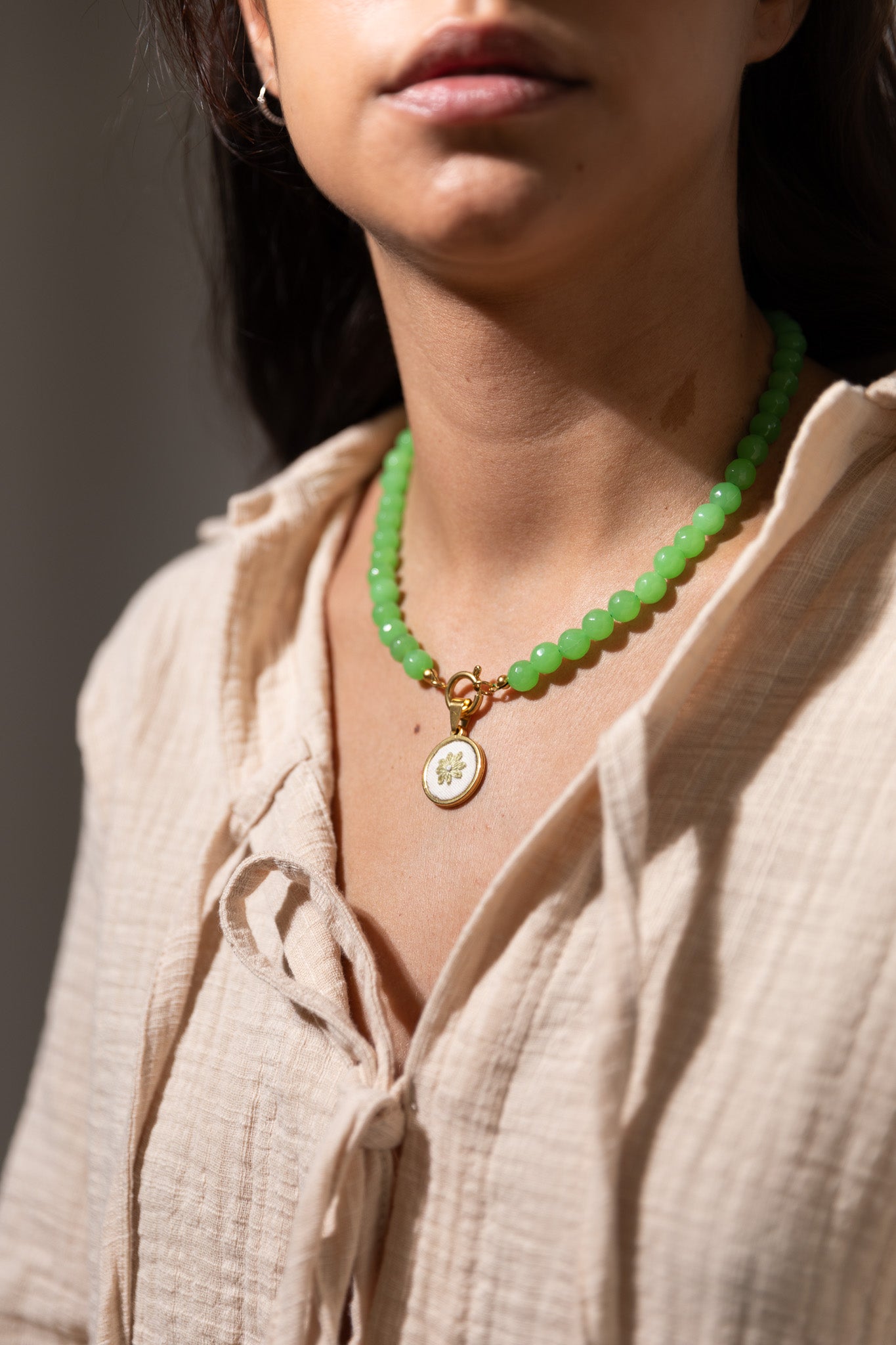 Colar de pérolas com flor bordada à mão