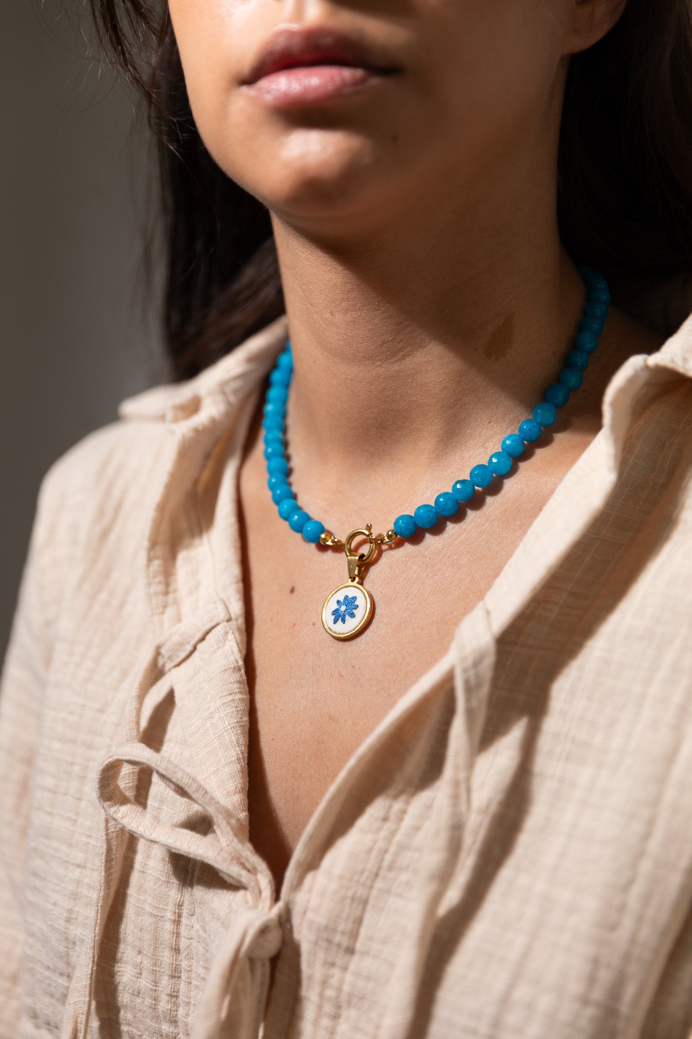 Apesar do colar ser de aço inoxidável, não é recomendado molhá-lo por ser feito em tecido e bordado - pode danificar